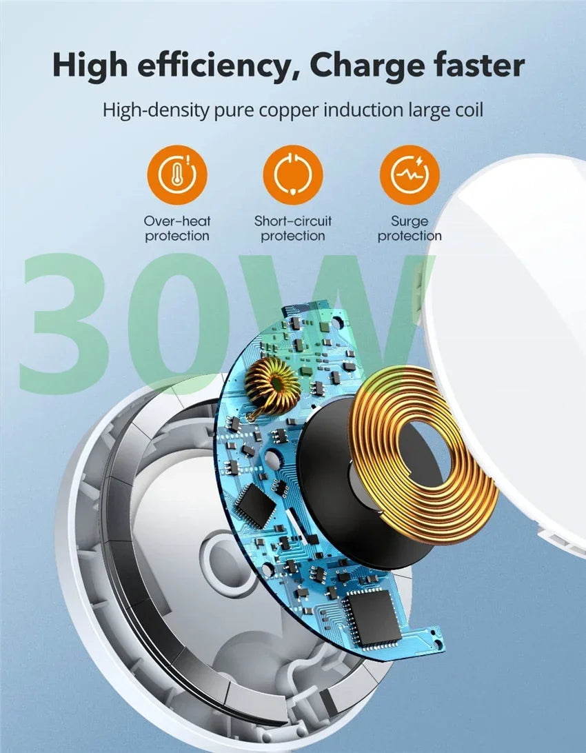 30W Magnetic Wireless Charger Pad – Fast Charging Stand for iPhone, AirPods & USB-A